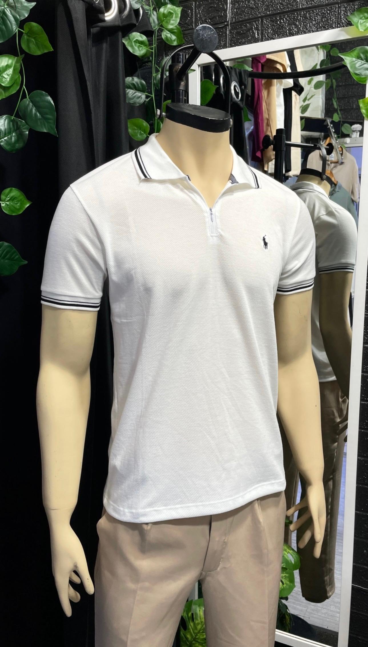 Un polo camisero para hombre en blanco con cierre en el cuello y detalles sutiles que lo hacen verse old money sin esfuerzo. La textura tipo piqué, el zip y los ribetes finos le dan ese look limpio, serio y premium que combina con todo.